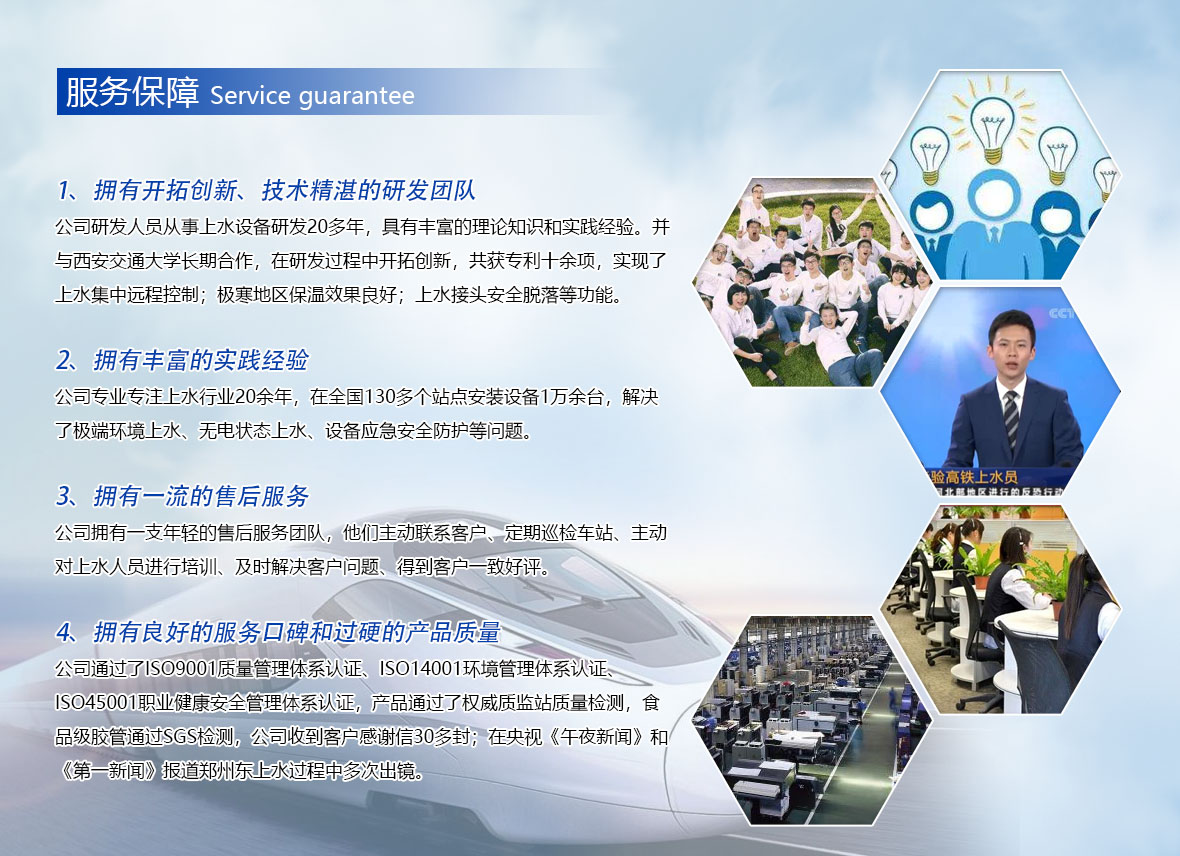 該報(bào)道內(nèi)容:鄭州東站一群年青上水員在暑運(yùn)、高溫大客流的背景下每天對(duì)來(lái)往60趟高鐵進(jìn)行上水作業(yè),且上水時(shí)間主要集中在下午1點(diǎn)至3點(diǎn),在高鐵途徑停站時(shí)間如此短,股道之間溫度達(dá)60度左右的環(huán)境下,上水人員能不畏炎熱、心懷旅客、高質(zhì)量的完成上水。在此過(guò)程中,上水人員所使用的上水設(shè)備多次出現(xiàn)在報(bào)道中,而這些上水設(shè)備就是由我公司生產(chǎn)、安裝的。